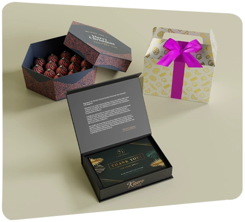 We offer high-quality printing, embossing, debossing, foil stamping, spot UV, and matte/glossy lamination to enhance the look of your custom gift boxes.