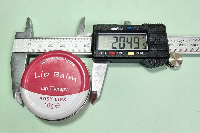 To measure the cylindrical product, you have to place it in between the claws as shown in the image below. We will also consider the lid sides as well when measuring its length and width. In our case, it was 2.049 inches.