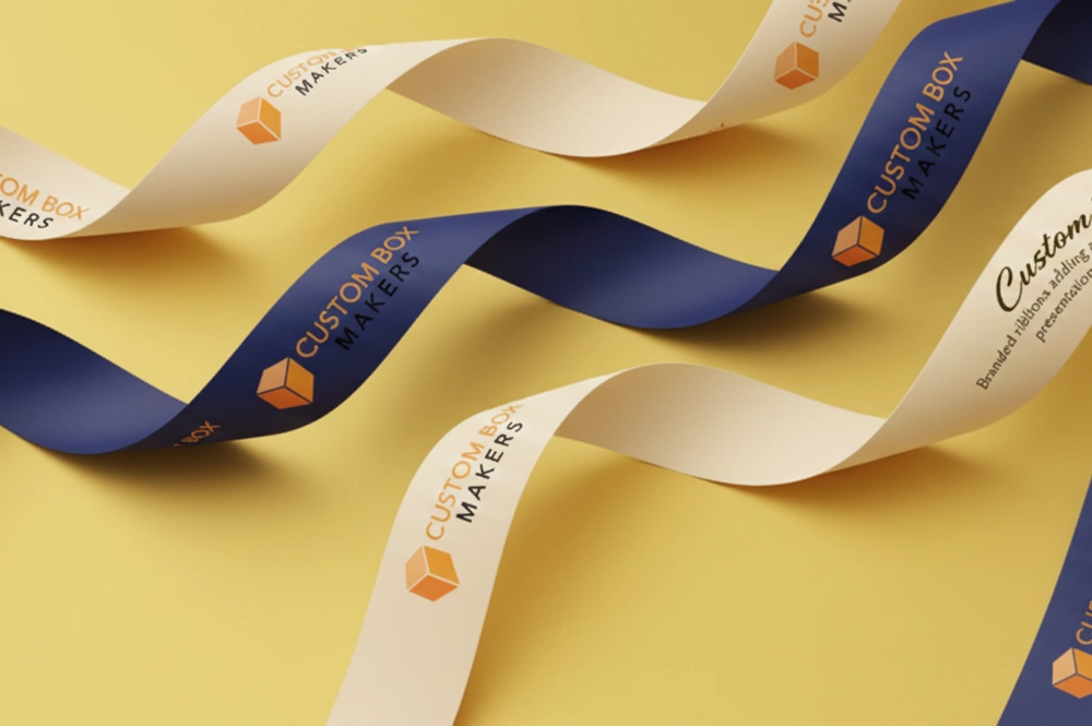 Branded ribbons adding, decorative, classy touch to packaging presentation design.