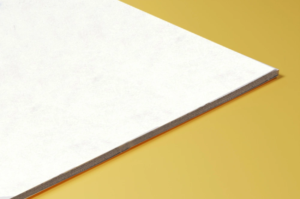 Recycled chipboard with a white coated surface for sharp, high-quality printing.