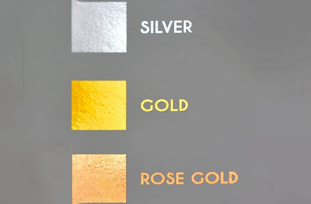 Heat-applied metallic or pigment foil creating reflective luxury accents details.